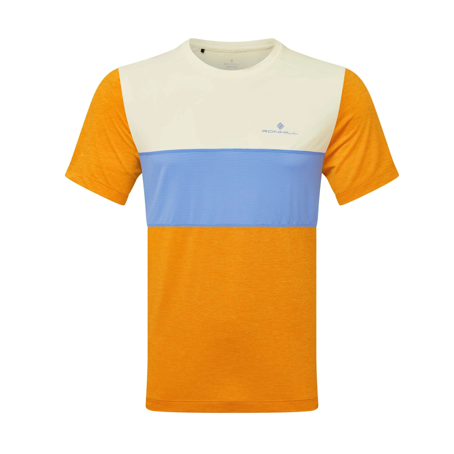 The men’s Ronhill Tech Trio S/S Tee in Spice Marl resembles a classic heritage running top. Tri-coloured panels on the front have a soft pastel effect. Further playing into the look and feel of what club runners wore in the past. This wouldn’t look out of place when the late Ron Hill was clocking his biggest mileage weeks.